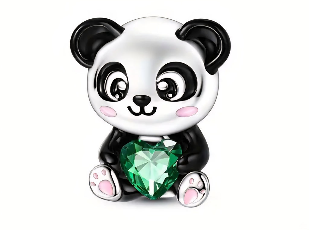 Panda with Green Stone Heart Charm - Compatible with Pandora Bracelets