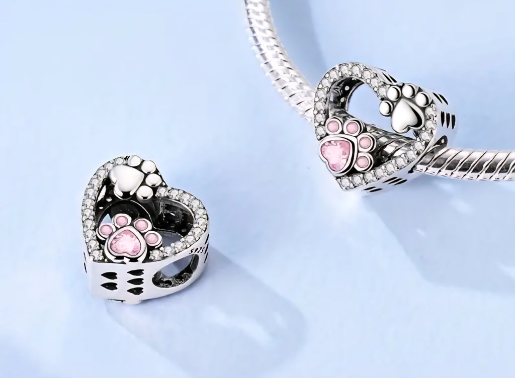 Paw Print Pink Stone Heart Charm - Compatible with Pandora Bracelets